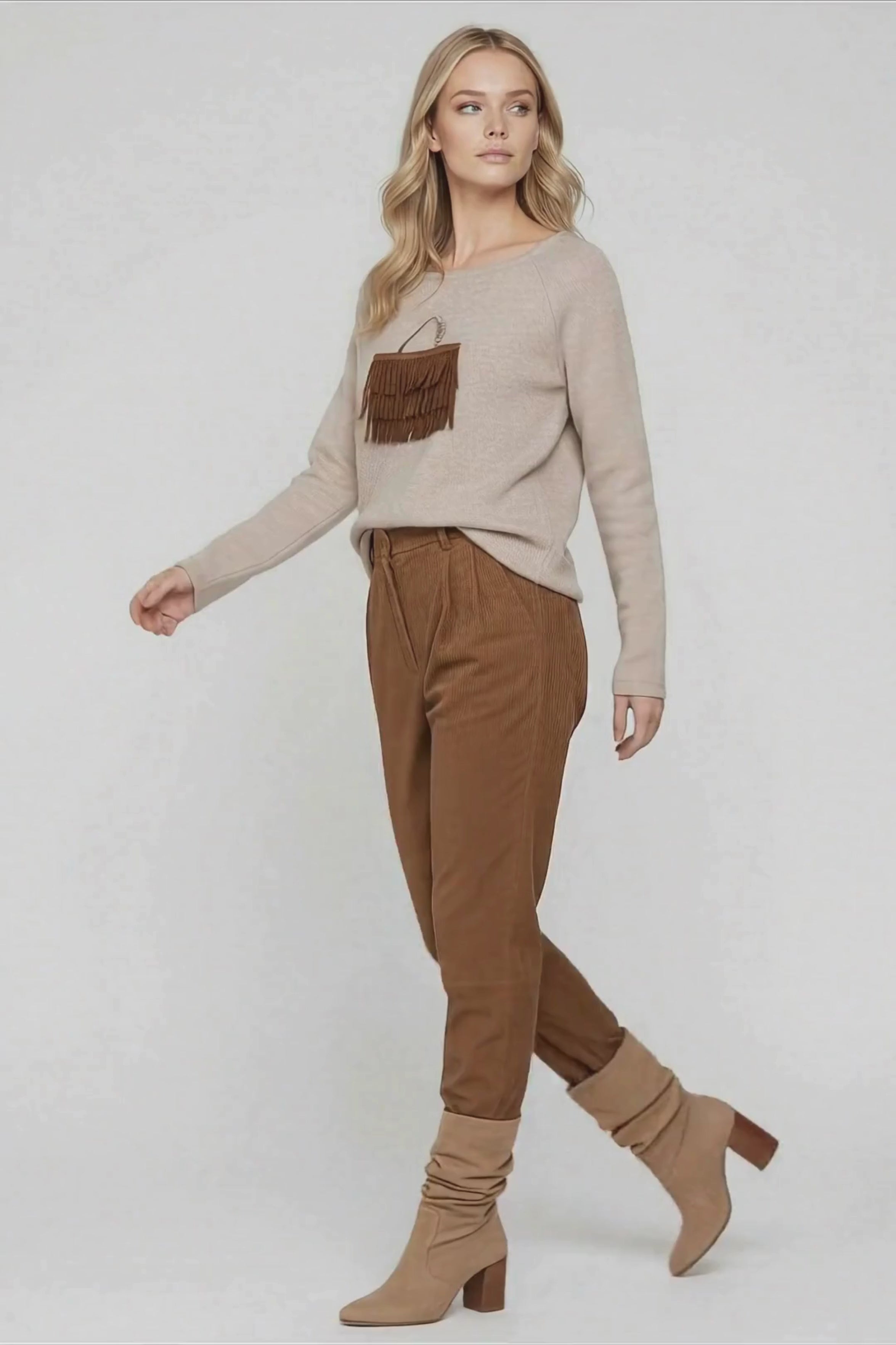 Camiseta de punto beige con bolsito de antelina flecos Lolitas&L