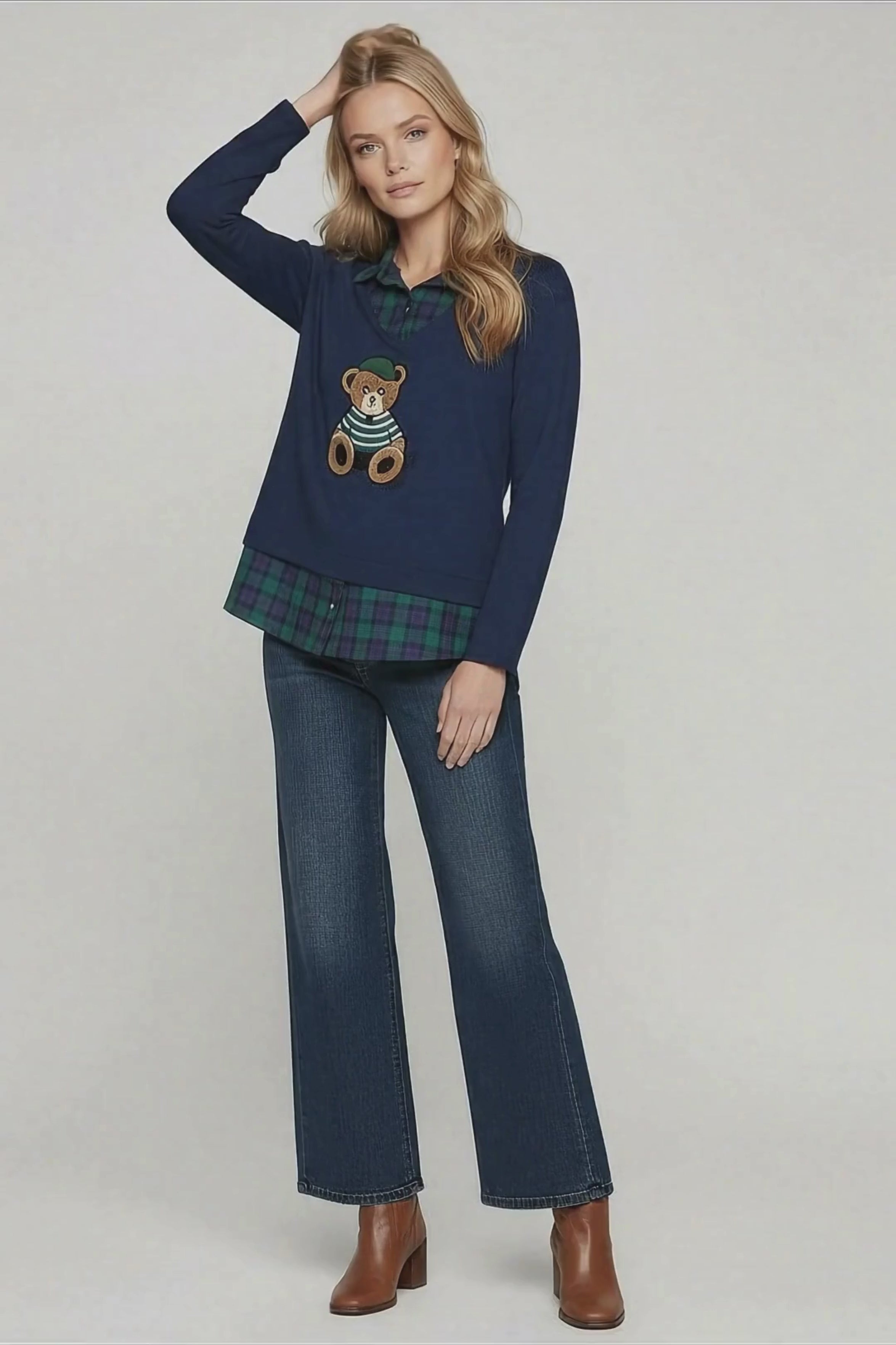 Olvida las camisetas para mujer convencionales. Esta pieza es un ejercicio de diseño inteligente: el cuerpo en azul marino profundo contrasta armónicamente con los añadidos en cuadro escocés verde-azul estratégicamente colocados. El cuello camisero con el tartán te da ese aire preppy-sofisticado, mientras el contorno inferior también en cuadro escocés crea el efecto de llevar una camisa anudada bajo tu camiseta sin el volumen ni las complicaciones. Y en el centro de todo, un osito bordado que es pura ternura artesanal.