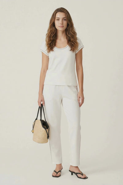 Porque tiene ese equilibrio perfecto: es una camiseta blanca que puedes usar mil veces a la semana, pero la tira de strass en el escote y las mangas la convierte en algo más. No necesitas ponerte collares o pulseras porque el detalle ya está incorporado. Es elegante, discreta y súper versátil.