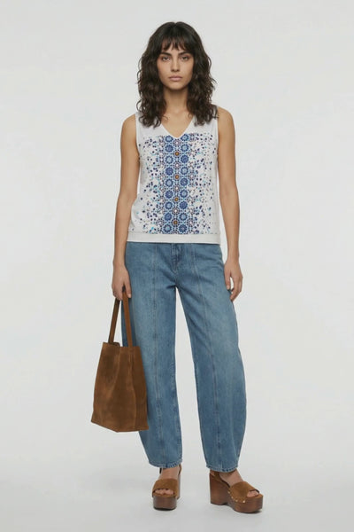 El escote en V amplio favorece a todas: alarga el cuello, estiliza y es uno de los escotes más universalmente favorecedores, especialmente en camisetas sin mangas.