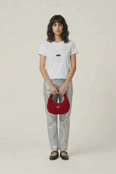 Esta camiseta blanca eleva el concepto de básico esencial con su espectacular diseño de strass brillantes que caen en cascada formando un patrón geométrico elegante. El detalle de cristales aplicados a mano crea un efecto visual sofisticado que atrapa la luz, convirtiendo una camiseta básica en una prenda con personalidad propia. El logo Lolitas&L bordado en contraste negro y fucsia añade el toque distintivo de la marca.