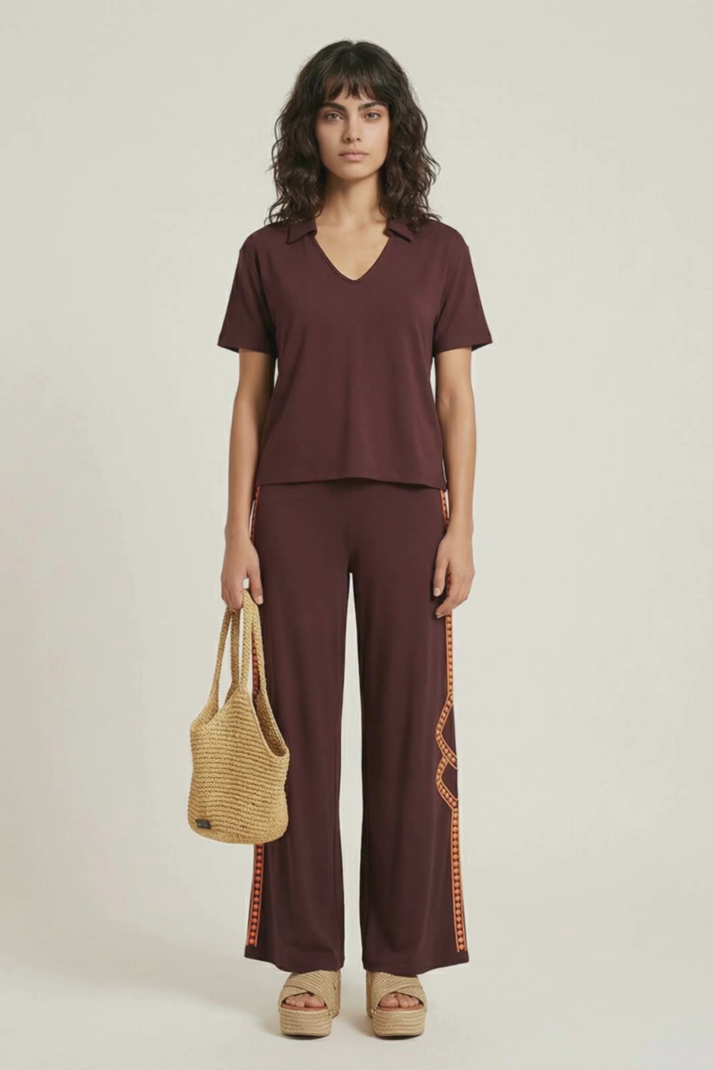 Polo marrón chocolate con escote en V amplio - Viscosa fluida - Estilo deportivo-chic minimalista - Fabricada en Portugal