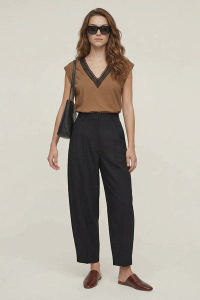 Pantalón negro de pinzas + mules marrones + bolso negro + gafas oversized. Marrón-negro es combinación clásica understated.