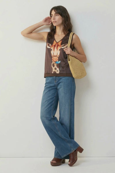 Como en la foto con vaqueros anchos, zuecos con tachuelas y un bolso de rafia. El marrón con denim es una combinación clásica y la jirafa le da ese toque divertido. Perfecto para el día a día con personalidad.