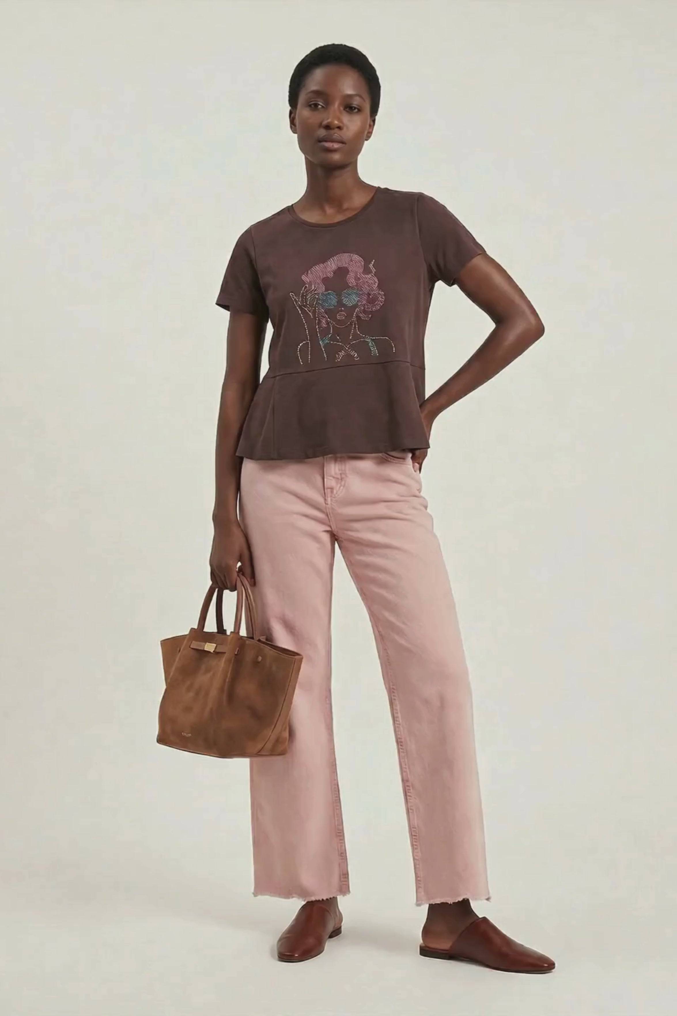 Esta camiseta es para quien entiende moda como forma de arte aplicado. A 69,90 €, es inversión en pieza portuguesa con trabajo artesanal que justifica precio premium: aplicar strass multicolor formando ilustración compleja de mujer glamurosa requiere precisión, tiempo, y habilidad. Es homenaje a ilustración de moda (tradición que precede fotografía en revistas de moda) y a cultura de gafas de sol como símbolo de sofisticación, misterio, glamour Hollywood. El marrón chocolate es elección cromática sofisticada que diferencia: donde muchas elegirían negro obvio, marrón es neutro cálido elegante que favorece especialmente tonos de piel cálidos. El corte peplum no es decoración sino estrategia de favorecimiento: marca cintura creando silueta reloj de arena, volante equilibra proporciones. Los bolsillos integrados son sorpresa bienvenida (funcionalidad donde típicamente no existe). Fabricada en Portugal con algodón de calidad. Es tipo de prenda que profesionales de moda reconocen como considerada: la ilustración podría ser impresa (más barato) pero strass añaden dimensión táctil y brillo que impresión no tiene. Es para quien valora artesanía, referencias culturales, y sofisticación que no es obvia sino cultivada. Es declaración de que estilo es conocimiento: reconoces herencia de ilustración fashion, valoras trabajo manual, aprecias marrón como neutro sofisticado.