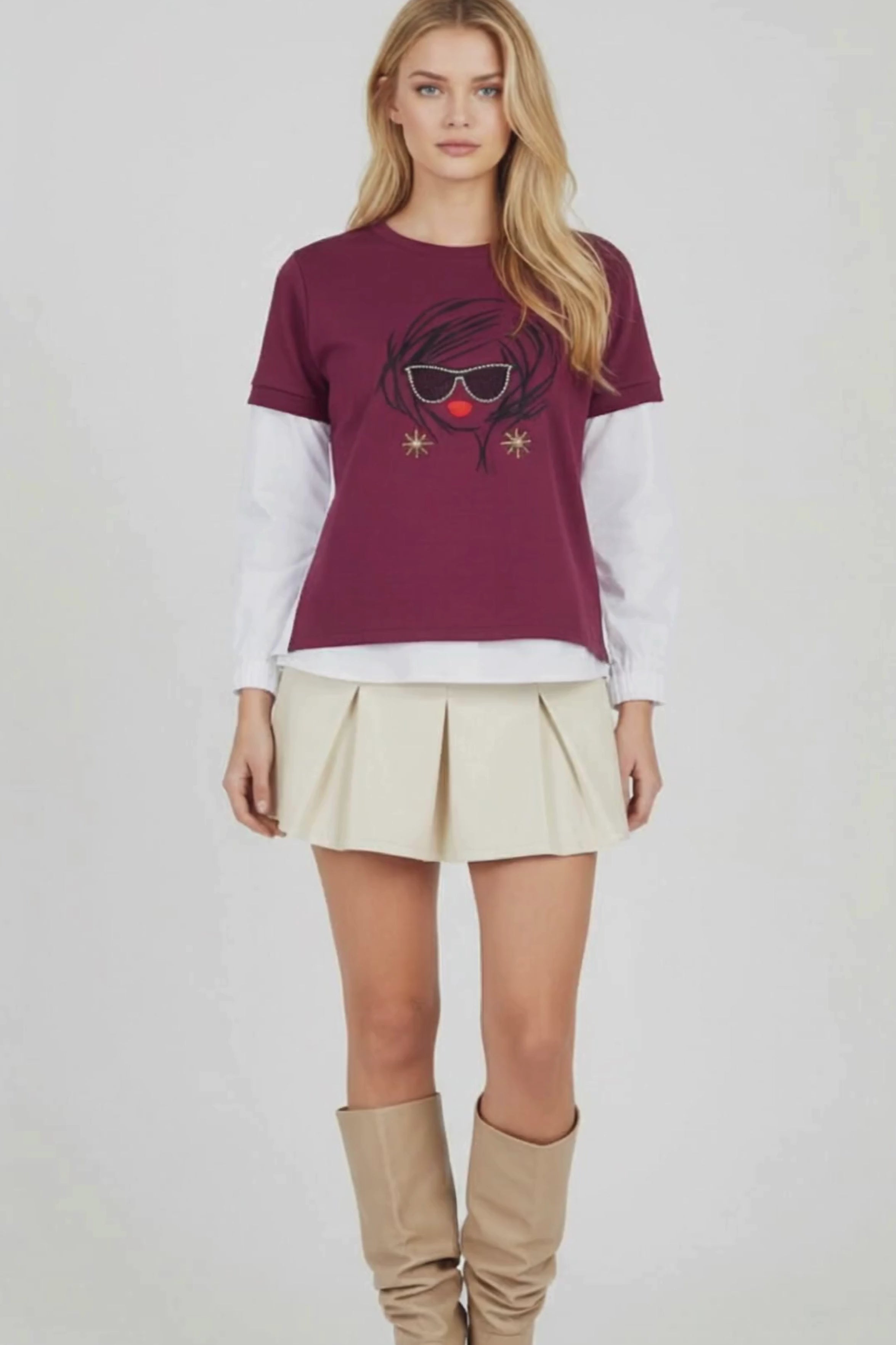 El estampado con cara y gafas decorado con strass en el delantero es pura actitud: moderna, desenfadada y totalmente tú. Porque el estilo real no susurra, se expresa con colores que dicen presente.