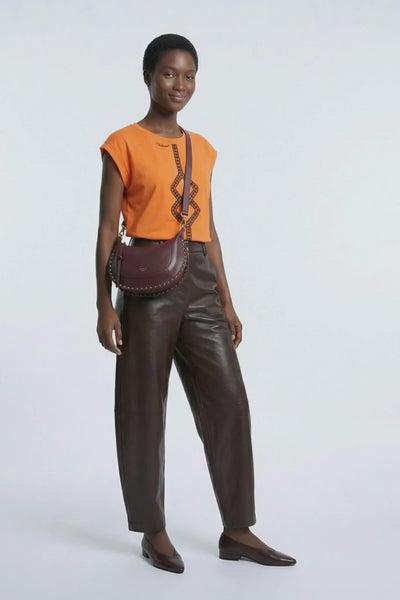 Pantalón marrón chocolate coordinando con cenefa bordada, más sandalias marrones y bolso cuero. Naranja-marrón es combinación terrosa sofisticada.