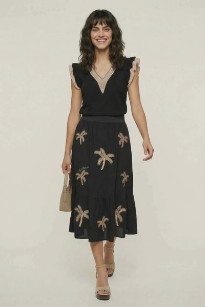 Falda negra larga con bordados de palmeras Lolitas&L (disponible en nuestra colección) + sandalias de tacón nude + bolso beige + joyas discretas. El conjunto perfecto para eventos veraniegos elegantes.