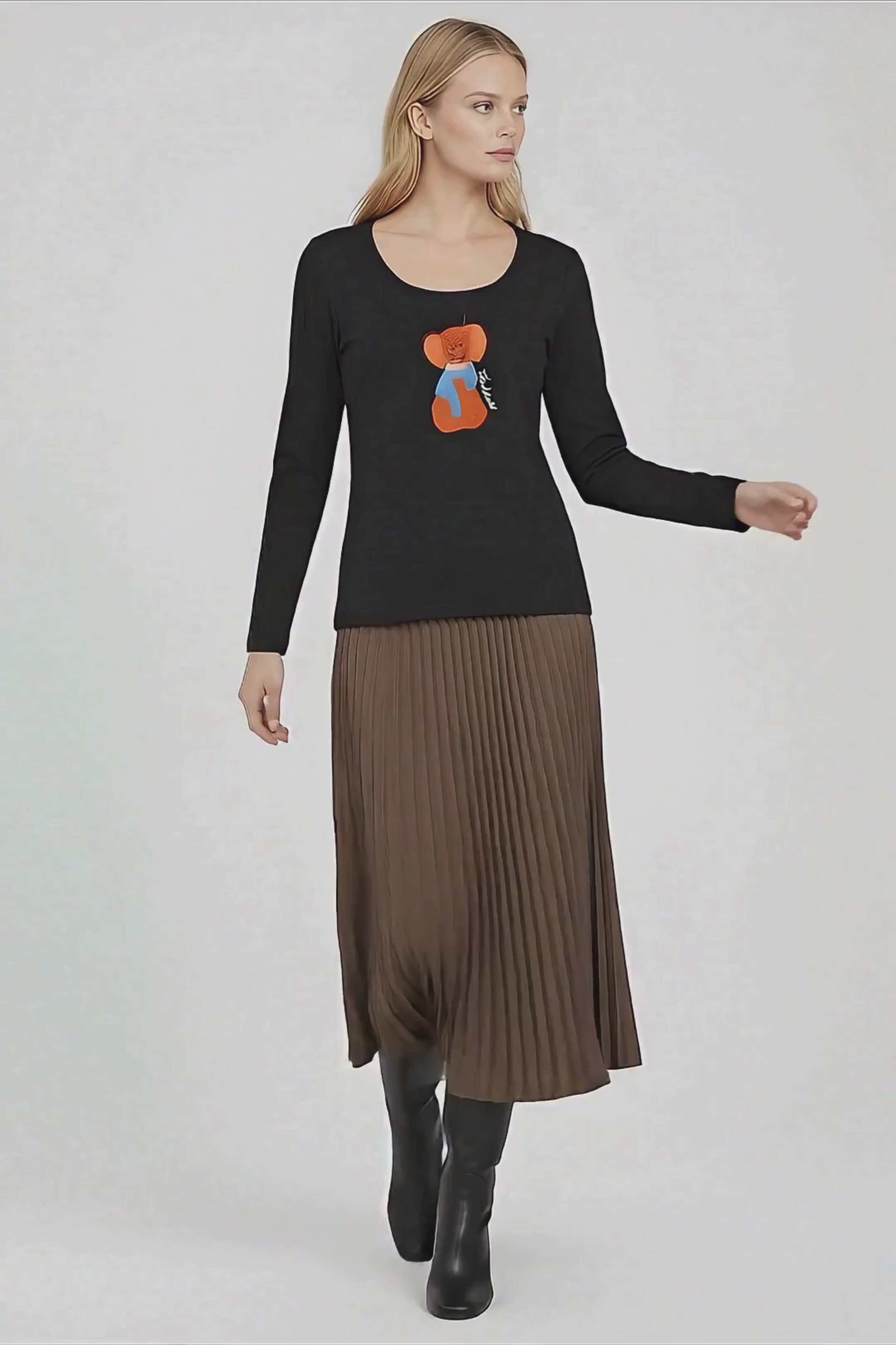 Porque no todas las camisetas para mujer entienden que puedes ser sofisticada y tierna al mismo tiempo. Porque el osito bordado en punto alto es ese detalle artesanal que te diferencia con elegancia. Porque la aplicación marrón sobre negro crea ese contraste que funciona en múltiples contextos sin caer en lo infantil. Porque mereces prendas que reflejen todas tus facetas, que te permitan mostrar tu lado dulce sin renunciar al estilo, que te hagan sonreír cada vez que te las pones.