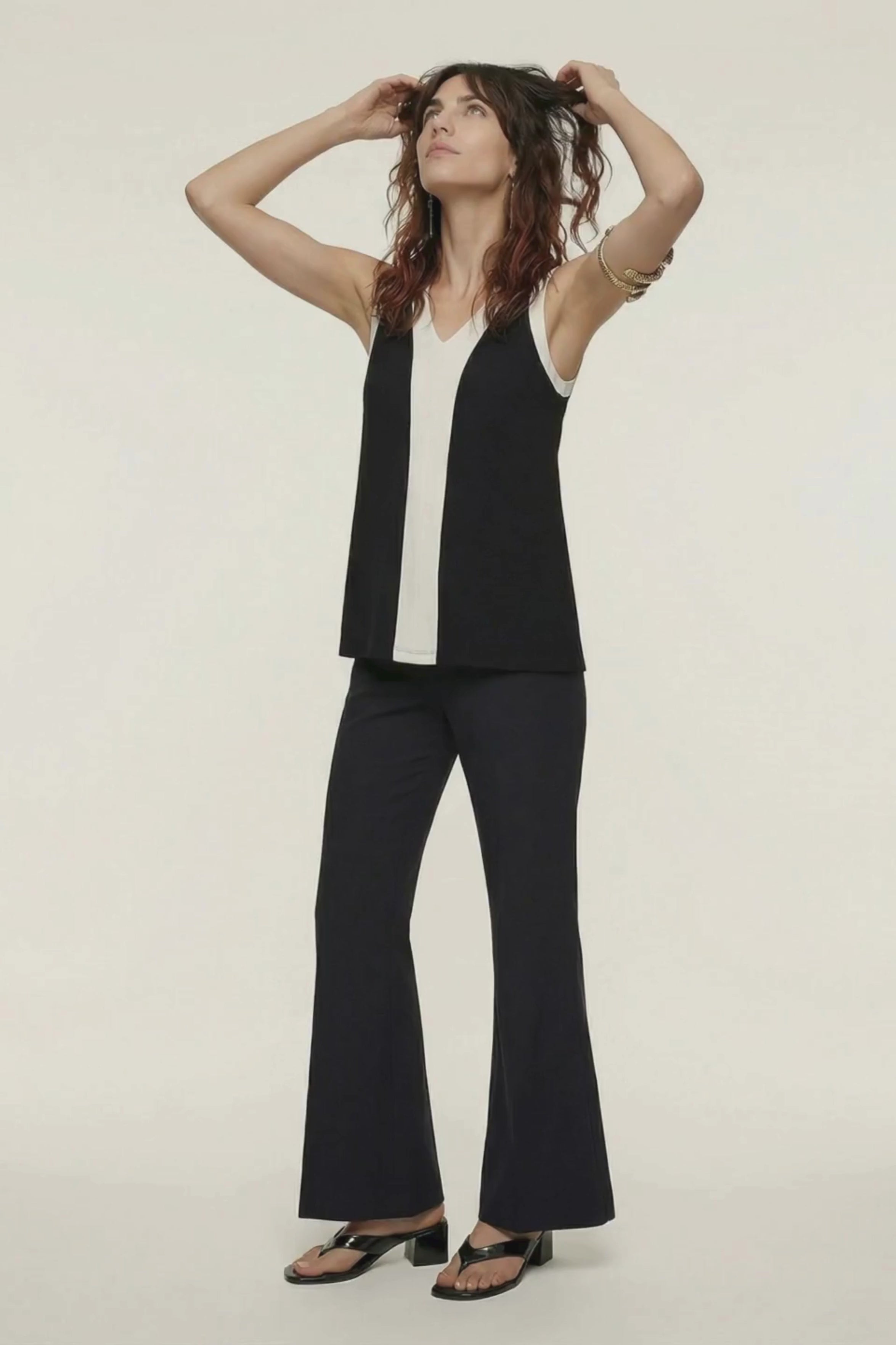 Confeccionada en viscosa con elastano, esta camiseta presenta escote en V moderado que favorece alargando cuello sin ser profundo excesivamente, tirantes anchos que proporcionan cobertura cómoda versus tirantes espagueti finos que pueden ser menos funcionales, panel blanco central vertical que recorre completo de escote a bajo creando línea estilizadora, ribetes blancos en sisas enmarcando bordes de tirantes limpiamente, y largo que cubre caderas apropiadamente permitiendo llevar metida o suelta según preferencia. A 59,90 €, es básico negro-blanco que trasciende basicidad mediante construcción colour blocking que requiere corte y ensamblaje preciso de paneles cromáticamente diferentes versus camiseta simple de una pieza monocromática.