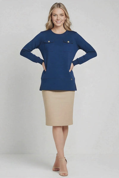 Este azul profundo no es un color cualquiera, es ese matiz que ilumina tu rostro, que transmite confianza y que funciona tanto en la oficina como en tu brunch del domingo. Esta camiseta de punto azul es esa pieza que buscabas sin saber que existía: elegante como una camisa, cómoda como tu sudadera favorita.