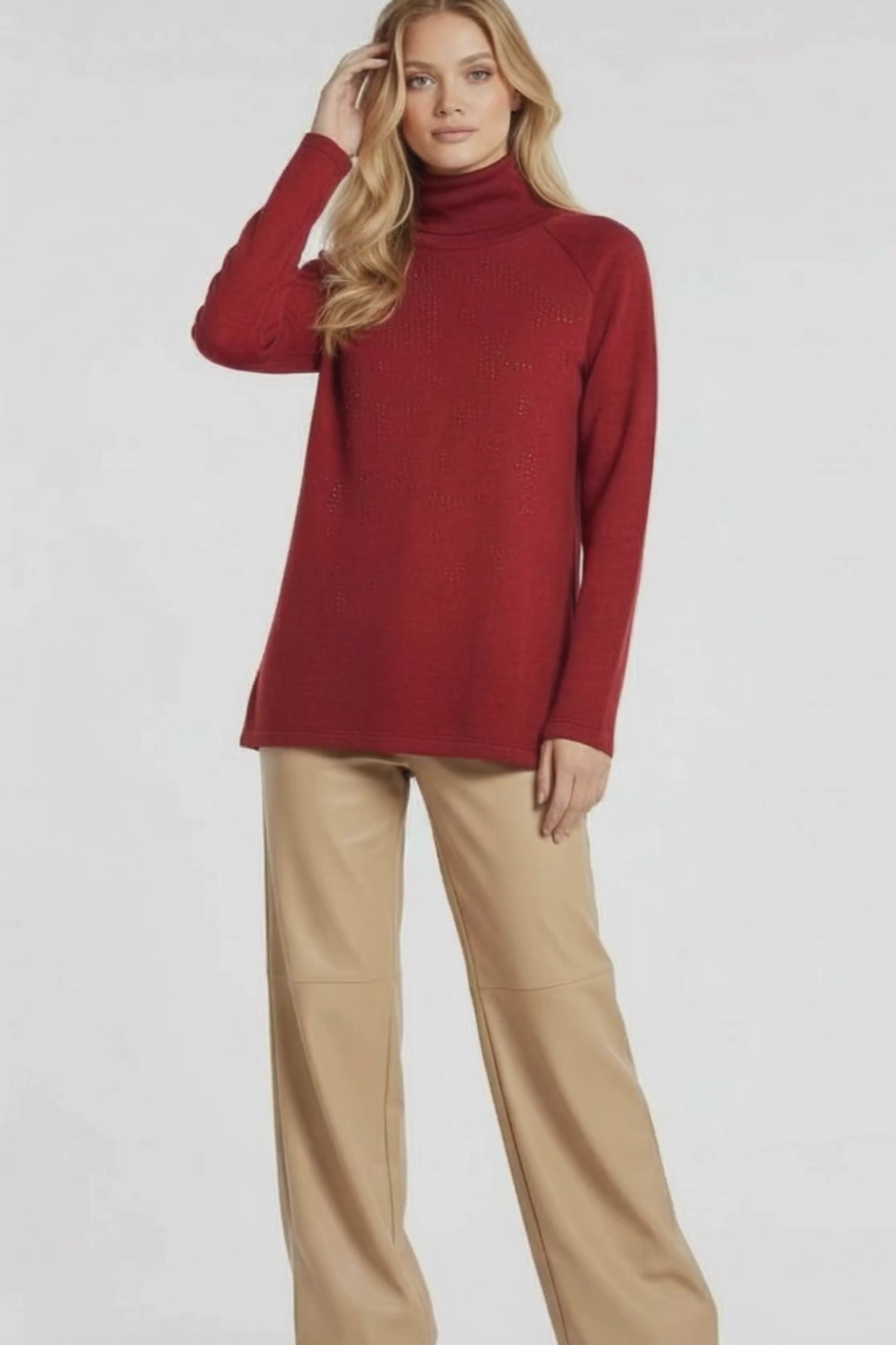 Los strass en tono granate brillan discretamente como joyas secretas sobre el delantero, creando un efecto monocromático elegante y atemporal. El cuello tortuga te envuelve en calidez mientras tú irradias estilo, y ese tono burdeos profundo te hace sentir poderosa desde el primer café hasta la última reunión del día.
