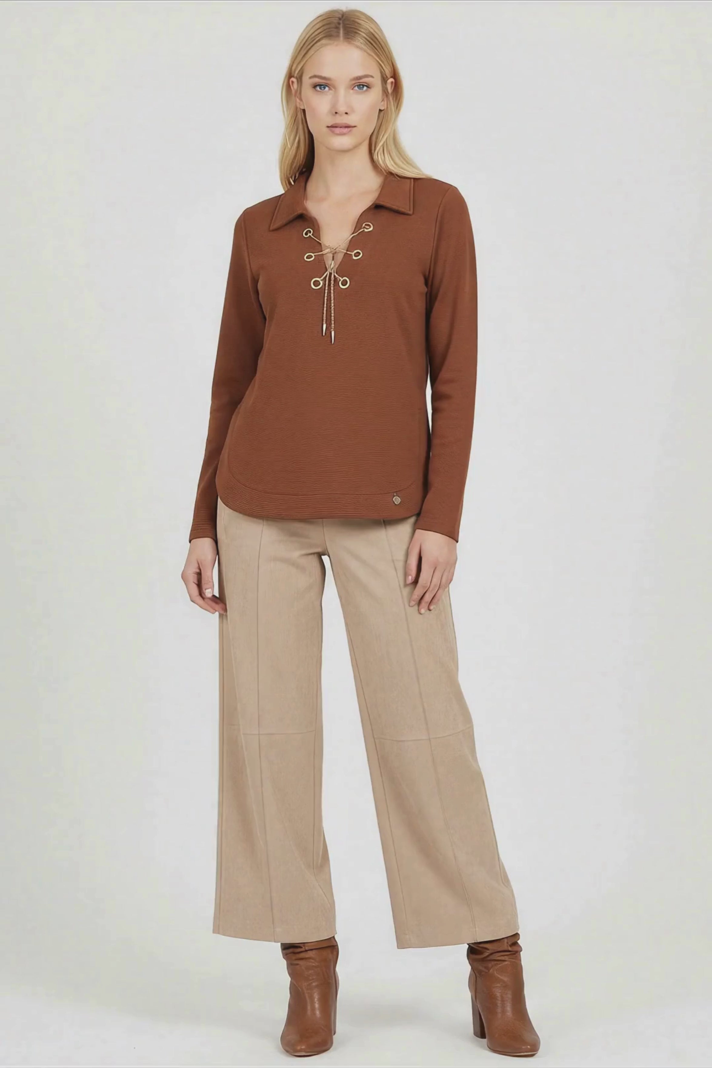 ¿Sabes esas camisetas con ojales que parecen sacadas de Pinterest pero que nunca encuentras en las tiendas? Esta es exactamente esa pieza. Funciona igual de bien con unos tacones para una cena especial que con tus zapatillas favoritas para el día a día. Es versátil sin ser aburrida, especial sin ser ostentosa, cómoda sin renunciar al estilo.