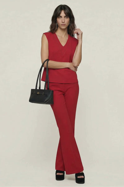 Esta camiseta roja es una inversión inteligente para cualquier armario. El rojo es un color de poder que transmite confianza, energía y sofisticación. El diseño sin mangas la convierte en una pieza versátil que funciona sola en verano o como base de capas en entretiempo. El escote en V favorece y estiliza, mientras que los strass tono sobre tono añaden ese detalle especial sin recargar. La viscosa portuguesa garantiza calidad y durabilidad. A 59,90 €, es una prenda que te sacará de apuros en infinitas ocasiones, desde la oficina hasta eventos especiales.