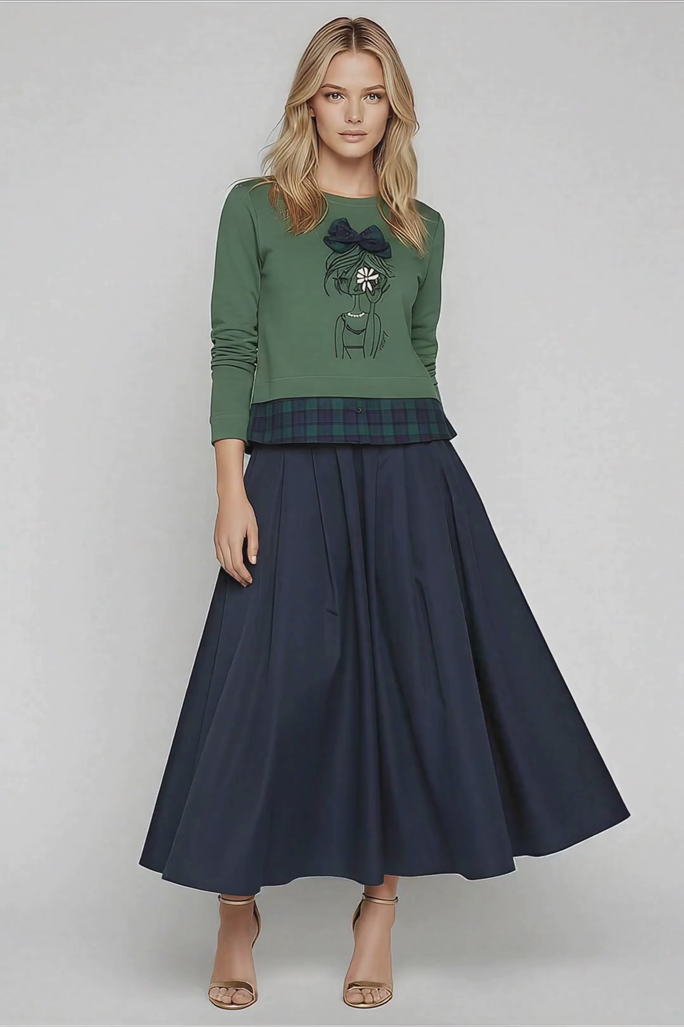 Esto no es una camiseta básica con un estampado cualquiera. Esta camiseta cuello camisero (bueno, con añadido camisero) reinventa lo que una prenda de algodón puede ser: el tejido verde de base contrasta con el cuadro escocés en tonos azules, el motivo de muñeca estampada se completa con un lazo tridimensional en tartan, y ese añadido camisero que asoma por abajo crea el efecto perfecto de capas sin complicaciones.
