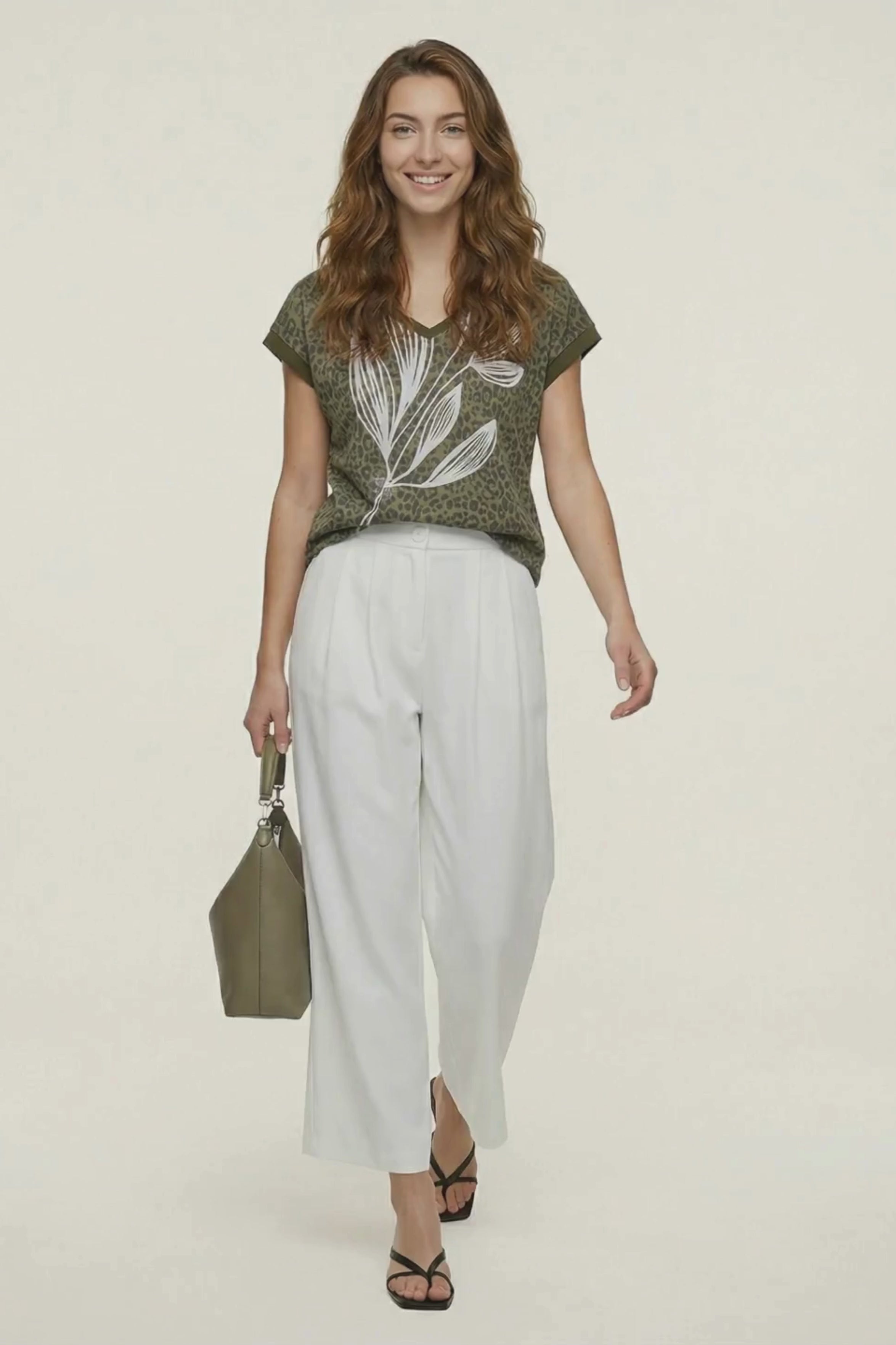 Como en la foto con pantalones blancos anchos, sandalias negras de tiras y un bolso verde militar. El contraste verde-blanco es clásico y el animal print le da ese toque de personalidad.