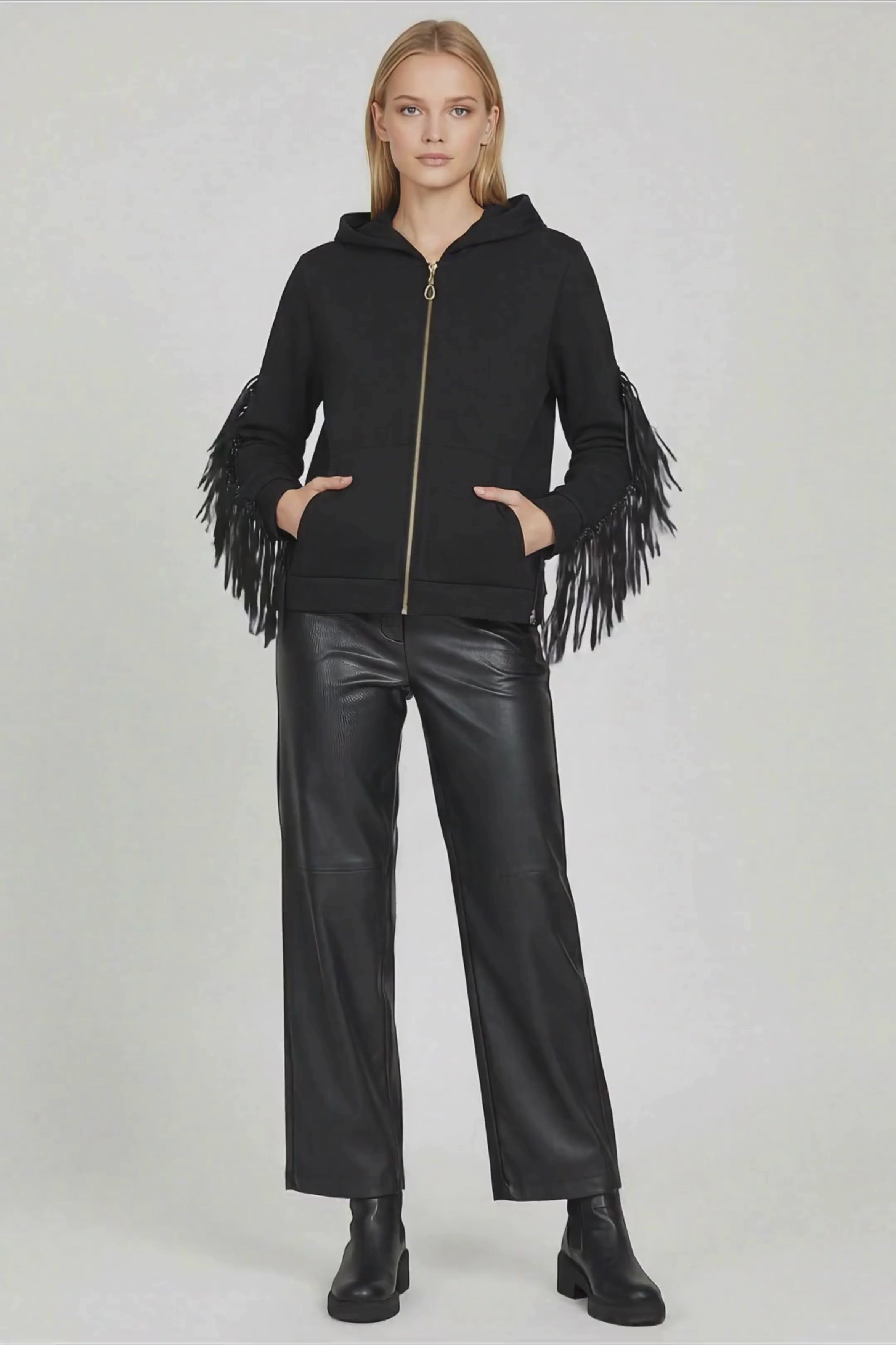 Esta chaqueta con capucha es para ti que entiendes que una cazadora puede ser tanto funcional como fashion statement. Los flecos hablan de tu lado más libre y bohemio-rock. La capucha demuestra tu lado práctico. La cremallera te da control total sobre tu look. El algodón cardado negro te mantiene abrigada sin perder la silueta. Es la cazadora que funciona tanto para tu concierto favorito como para tu día a día urbano.