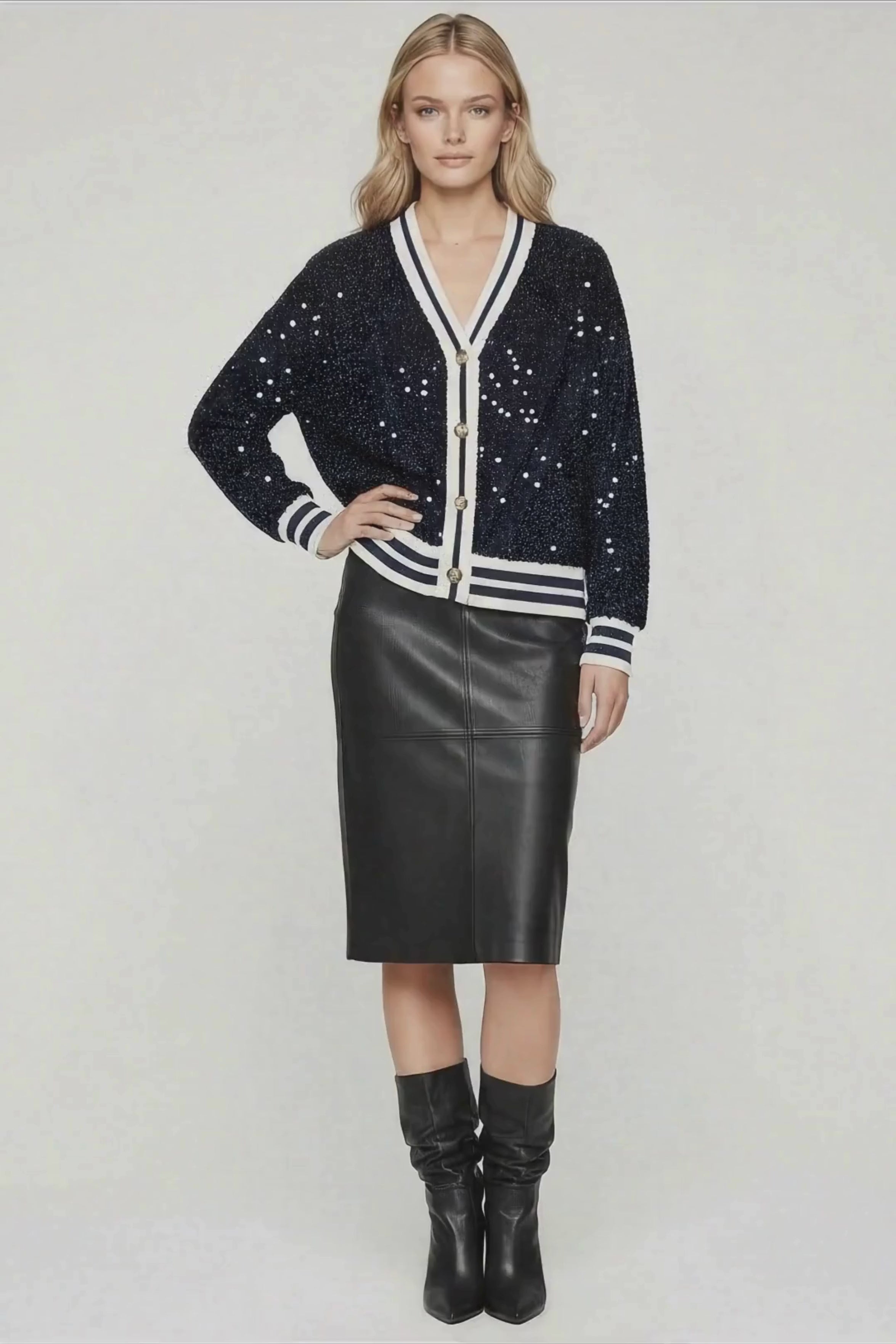 Esta chaqueta de lentejuelas azules es exactamente esa magia: todo el cuerpo cubierto de lentejuelas brillantes que capturan cada luz, elásticos deportivos en contorno y puños que definen la silueta con comodidad, escote en uve amplio que estiliza, y botones que añaden ese toque de estructura. Es discoteca con atletismo, es azul que brilla, es esa chaqueta que hace que todas las miradas se giren.