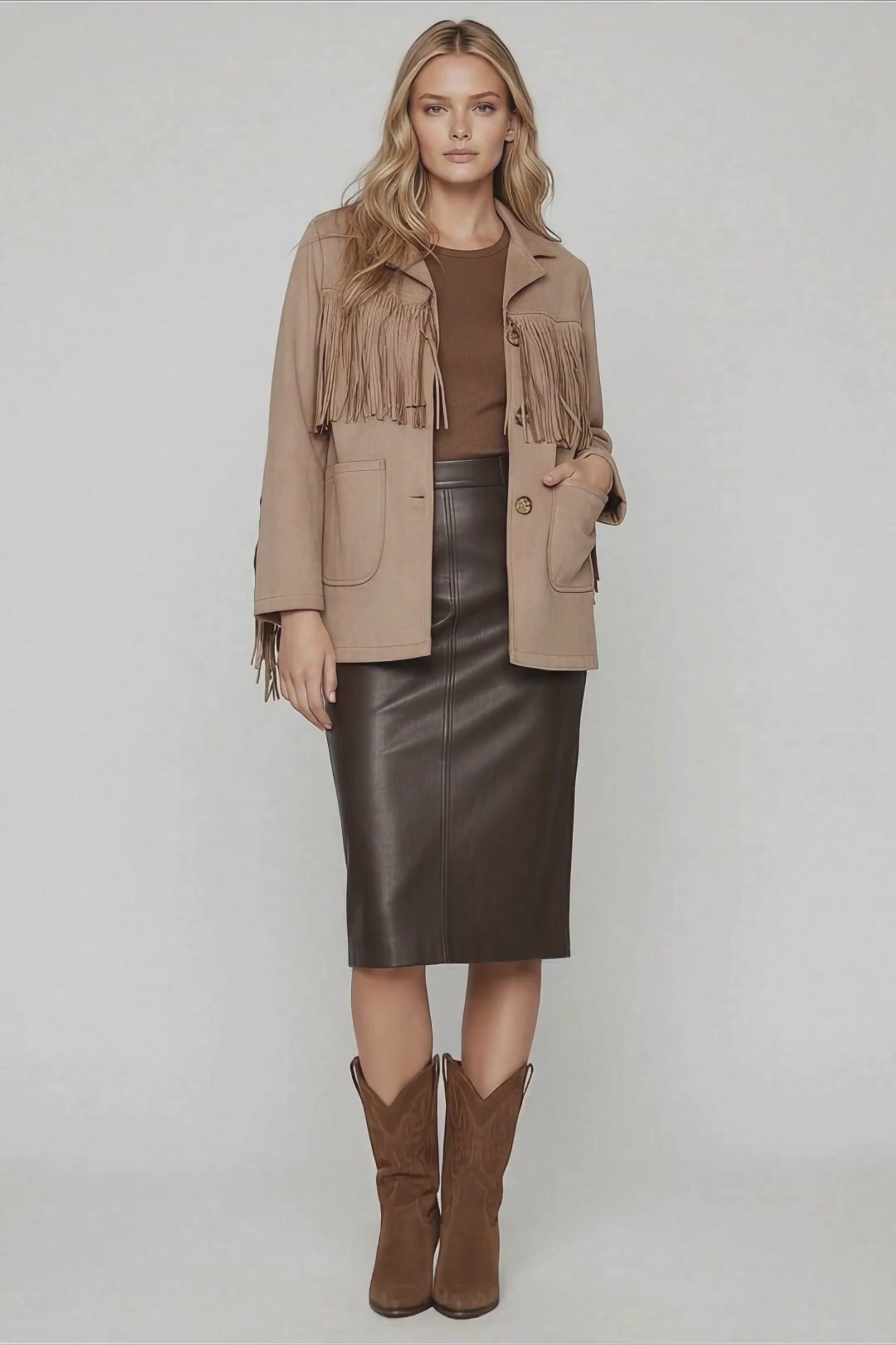Esta chaqueta de antelina beige con flecos es ese tipo de prenda que se convierte en tu mejor aliada cuando quieres destacar sin esfuerzo. Imagina esa sensación de llevar algo especial, algo que solo tú tienes en el armario. Esa textura suave al tacto, esos flecos que se mueven con cada paso que das... No es solo una chaqueta, es tu nueva firma personal.