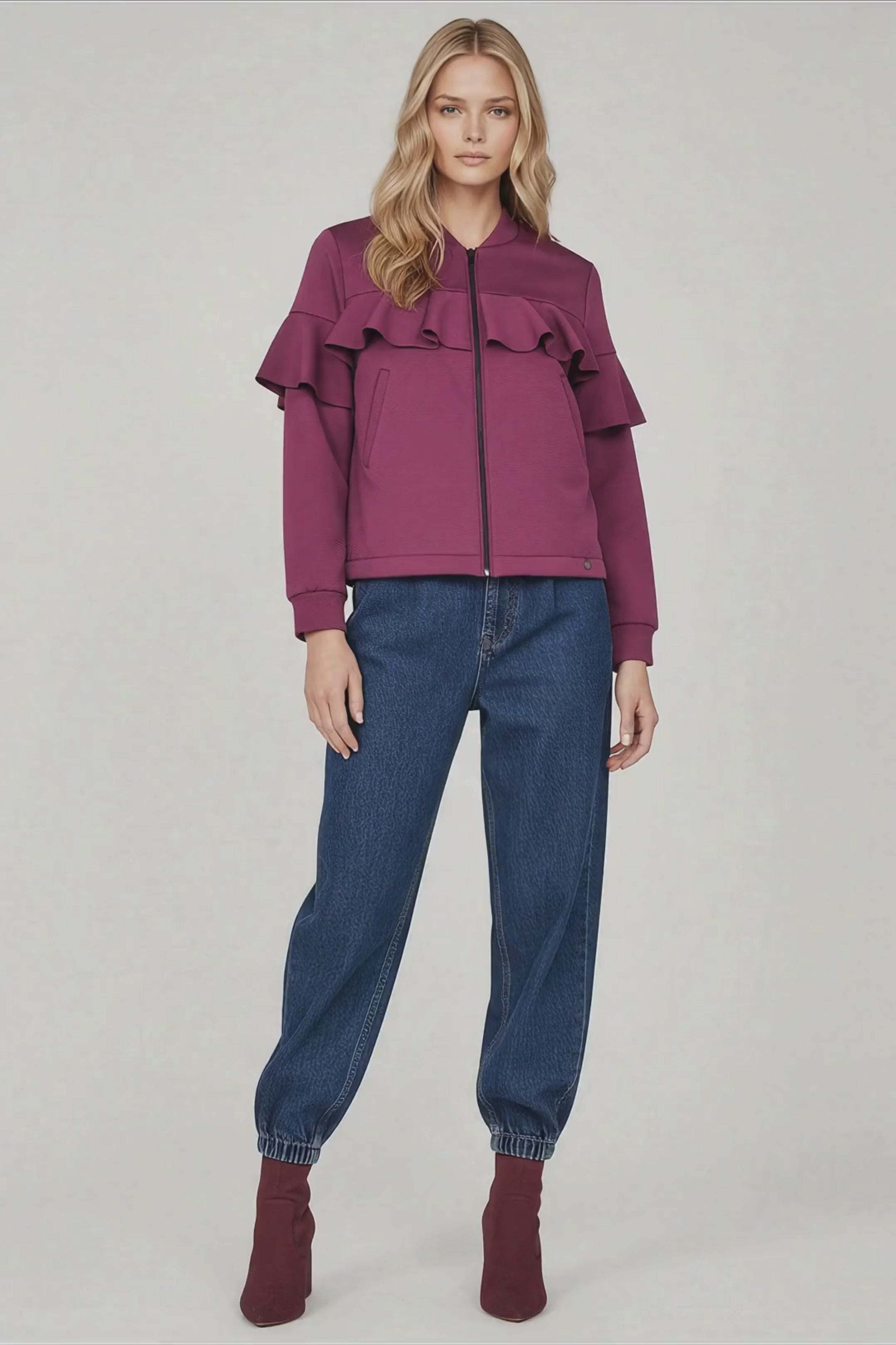 La cremallera completa te da opciones infinitas. Completamente cerrada para ese impacto cromático máximo donde el cereza domina completamente tu look. Semi abierta mostrando una camiseta o blusa interior que añade capas visuales. Abierta del todo usándola como capa ligera sobre tu outfit donde los volantes frontales crean un efecto cascada asimétrico. Es versatilidad integrada, es una chaqueta que se adapta a múltiples momentos.