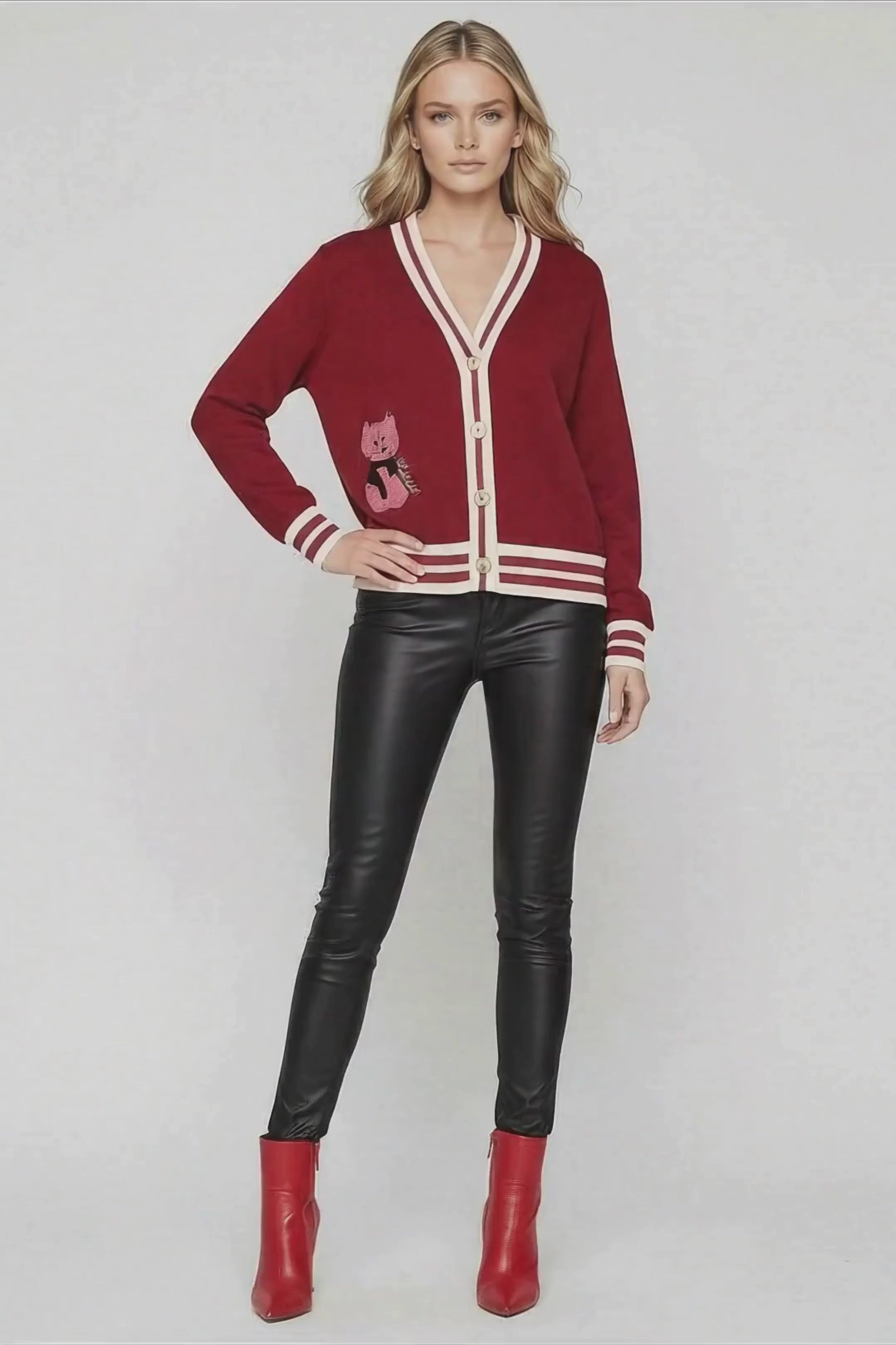 Esta chaqueta granate de punto es exactamente esa combinación perfecta que has estado buscando sin saberlo. Imagina ese abrazo cálido de un tejido suave, ese toque juguetón de un bordado inesperado y esa versatilidad que te permite ir del sofá a la calle sin cambiar de look. Porque tú eres esa mujer que sabe que el verdadero lujo está en sentirte bien contigo misma, y esta chaqueta lo entiende perfectamente.