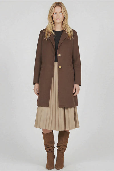 Olvídate de esas chaquetas que parecen buenas en la percha pero que luego no te pones. Esta chaqueta marrón es de las que se convierten en tu uniforme favorito, en esa pieza a la que recurres una y otra vez porque simplemente funciona. La antelina aporta esa sofisticación instantánea, el corte largo estiliza tu silueta, y los detalles como las solapas y los botones la convierten en una prenda atemporal que trasciende tendencias pasajeras.