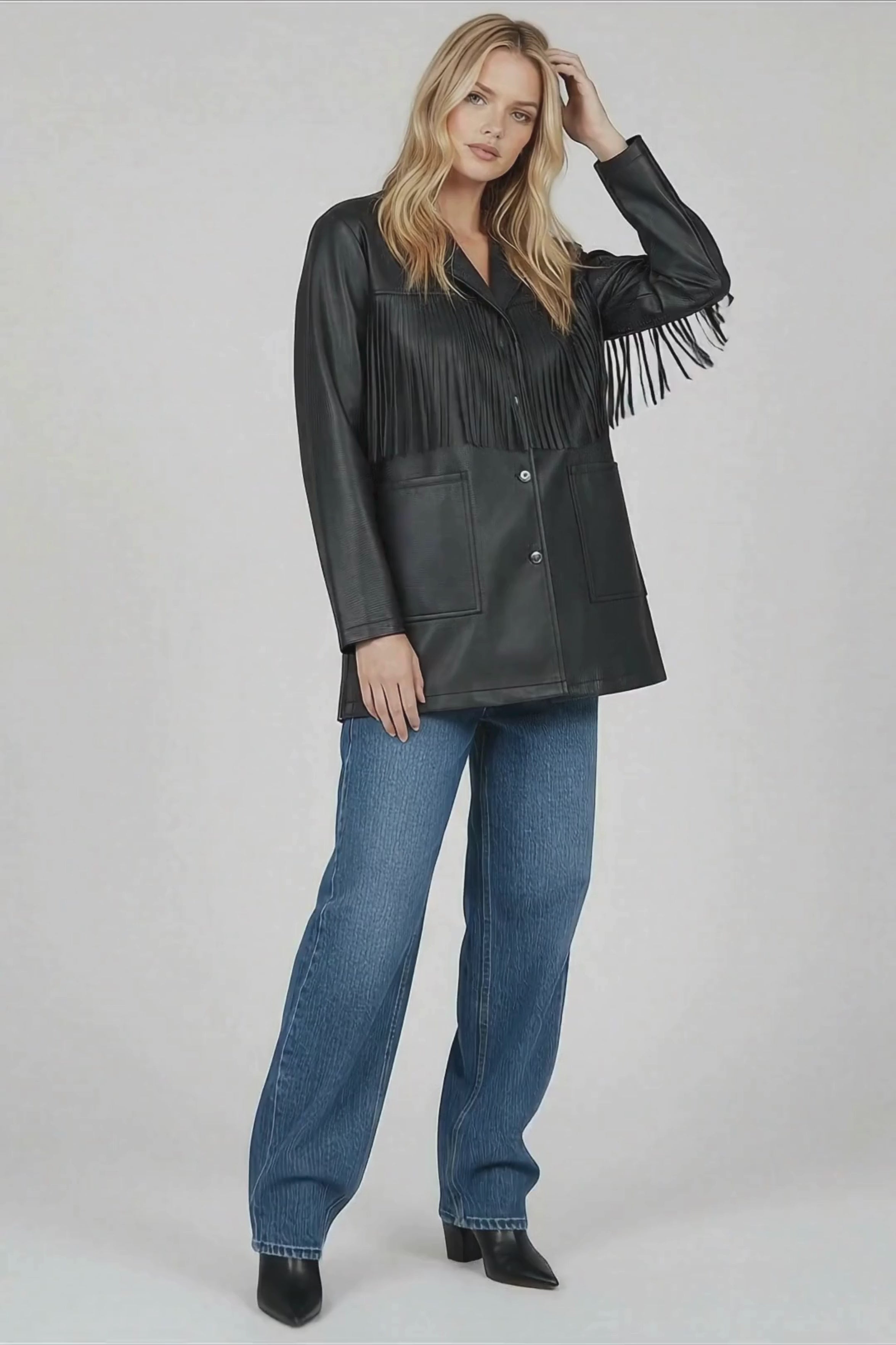 Esta chaqueta negra de polipiel con flecos es la respuesta a esa llamada interior. Imagina caminar por la calle y sentir cómo los flecos se mueven al ritmo de tus pasos, cómo las miradas se giran para descubrir quién es esa mujer con tanto estilo. No es solo una prenda, es tu declaración de independencia fashionista. Porque tú no sigues las reglas, tú las reescribes con cada look que creas.