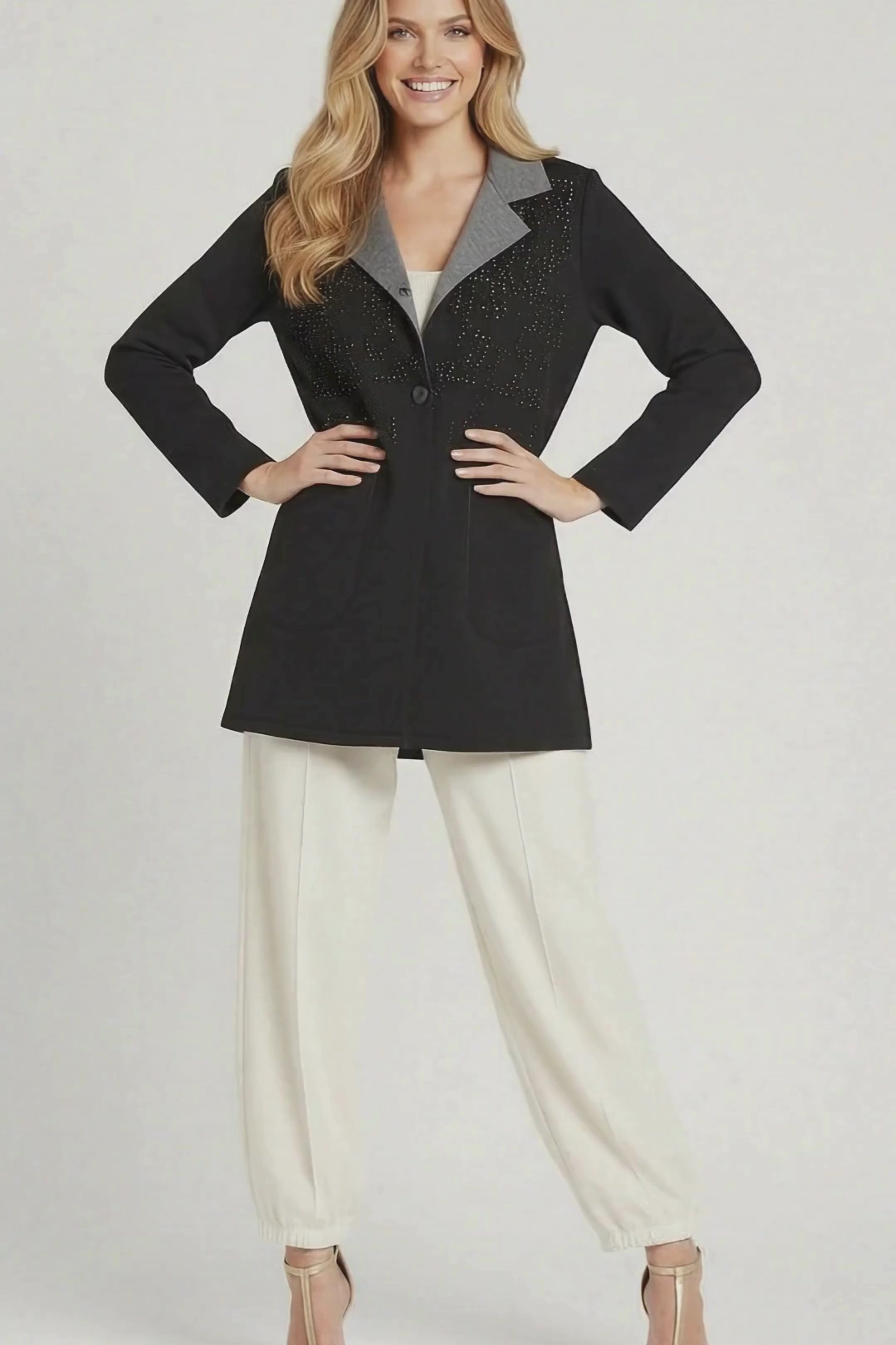 Hay chaquetas, y luego está ESTA chaqueta. Esta chaqueta de neopreno negro con interior gris es esa pieza que redefine tu armario completo. Los strass dorados brillan estratégicamente en el delantero como pequeñas constelaciones, mientras las solapas le dan ese aire de sastre moderno que te hace sentir poderosa.