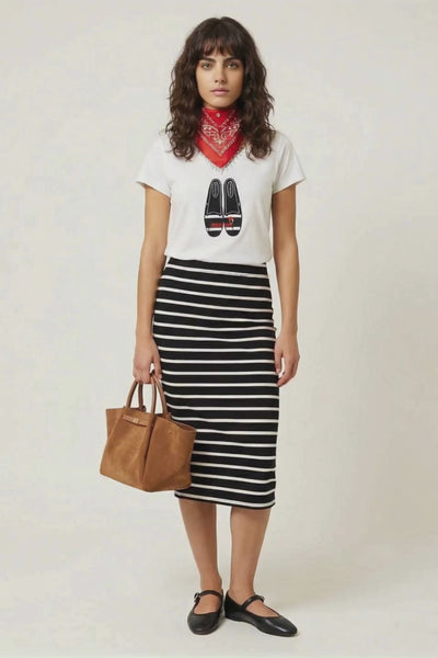 Absolutamente. La falda lápiz es uno de los básicos más profesionales. Las rayas marineras añaden personalidad sin ser inapropiadas.