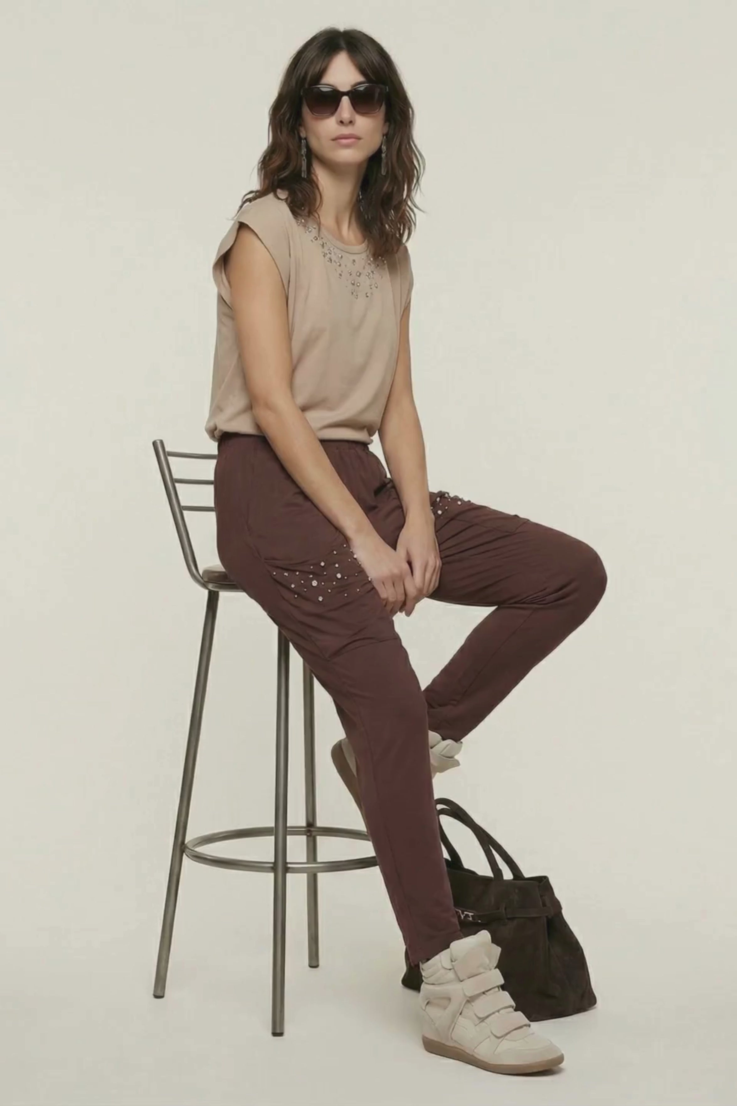 Porque tiene ese detalle de pedrería cristal en los bolsillos que lo convierte en algo más que un pantalón básico. El strass difuminado alrededor de los bolsillos es elegante, discreto pero suficiente para que no sea un pantalón de chándal cualquiera. Es cómodo como un jogging pero con estilo.