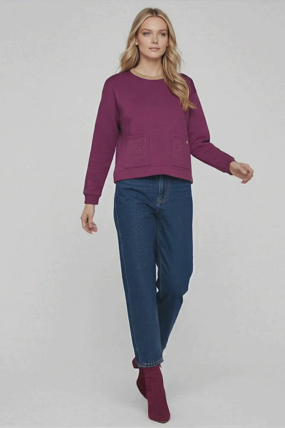 Despídete de las camisetas para mujer que te obligan a elegir entre comodidad o estilo. Esta sudadera con bolsillos en color cereza-granate profundo es pura sofisticación casual: los bolsillos de plastón en el delantero no solo son funcionales, están decorados con strass en tonos ocres y dorados creando destellos cálidos perfectos. El acabado en lurex dorado del escote añade ese brillo contenido que hace que tu rostro se ilumine. La manga larga mantiene la proporción equilibrada. Es riqueza cromática, es glamour vestible, es esa sudadera que resuelve mil looks.