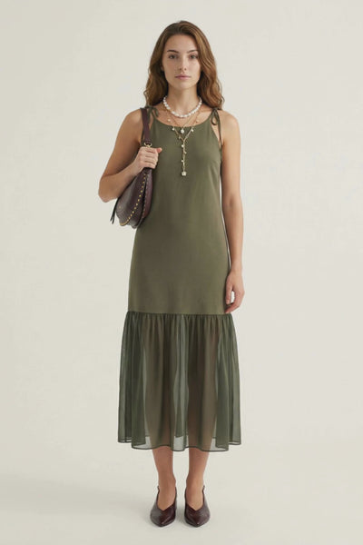 Porque combina lo mejor de dos mundos: la comodidad de un vestido de tirantes fresquito con el rollo boho-chic de la falda de gasa. El verde militar es ese color versátil que funciona en cualquier estación y combina con prácticamente todo lo que tengas en el armario.